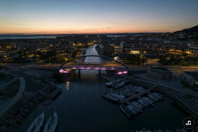 Travaux effectués : La passerelle est constitué d'un tablier métalliques type bowstring d'une seule travée de portée de 43 m entre axes d'appuis, avec un arc central. De part et d'autres un passage piétons côté mer (de 2 m de large) et un passage cycles côté terre (de 2.50 m de large).